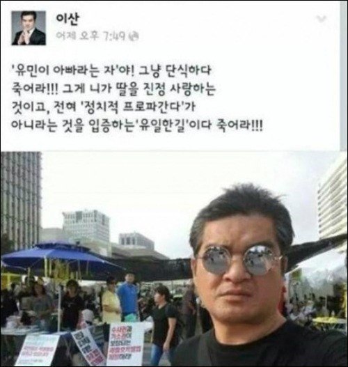 이산은 22일 자신의 SNS에 “유민이 아빠라는 자야, 그냥 단식하다 죽어라. 그게 네가 딸을 진정 사랑하는 것이고, 전혀 ‘정치적 프로파간다’가 아니라는 것을 입증하는 유일한 길이다. 죽어라”라는 글을 남겼다.