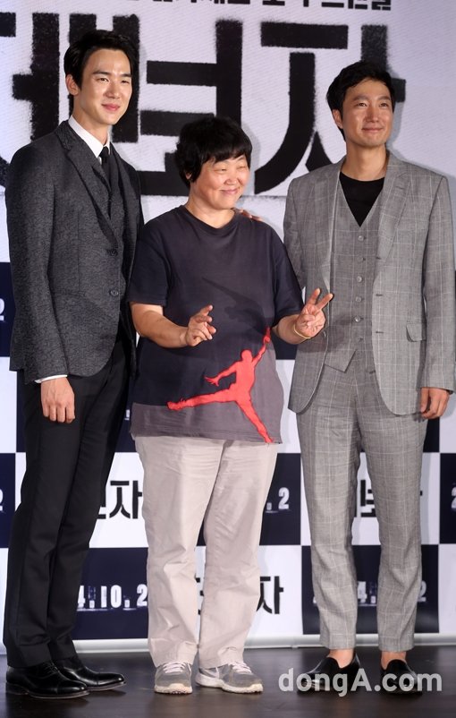 배우 유연석, 감독 임순례, 박해일(왼쪽부터)이 25일 오전 서울 중구 메가박스 동대문에서 열린 영화 '제보자' 제작보고회에 참석해 포토타임을 하고 있다.