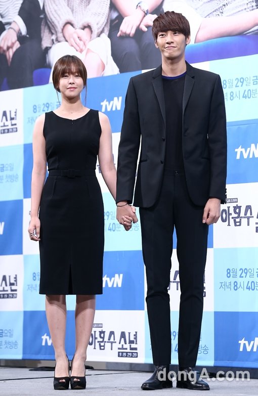 배우 경수진(왼쪽), 김영광이 25일 오후 서울시 강남구 임피리얼팰리스호텔에서 열린 tvN 금토드라마 ‘아홉수 소년’ 제작발표회에서 포토타임을 하고 있다.