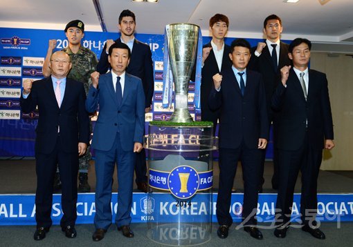 상주 박항서 감독, 전북 최강희 감독, 성남 이상윤 감독, 서울 최용수 감독(앞줄 왼쪽부터)이 25일 서울 신문로 축구회관에서 열린 ‘2014 하나은행 FA컵’ 준결승 대진 추첨에 앞서 파이팅을 외치고 있다. 뒷줄 왼쪽부터는 상주 권순형, 전북 카이오, 성남 김동섭, 서울 김용대. 김민성 기자 marineboy@donga.com 트위터 @bluemarine007