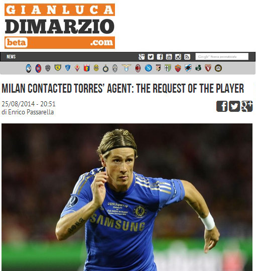 또한, 영국 일간지 ‘미러’ 역시 “AC 밀란이 토레스에게 관심을 보이고 있다”고 전했다. 이 매체는 “토레스는 첼시에 새로 영입된 디에고 코스타와 복귀한 디디에 드록바에 밀려 3번째로 치부되는 것에 불행해하고 있다”고 설명했다.