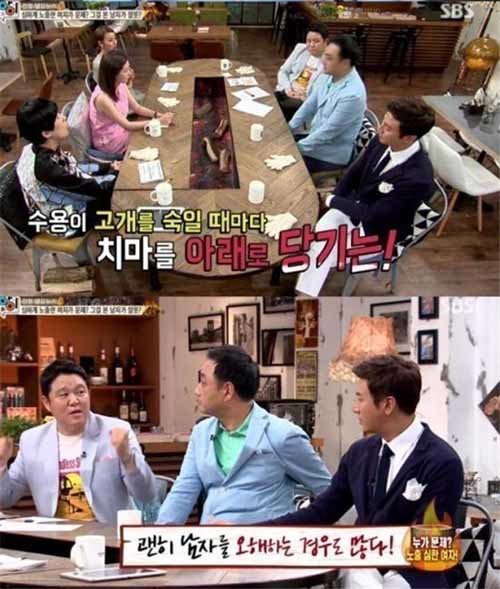 이날 김수용은 "여자 아나운서와 마주 본 상태에서 생방송을 한 일이 있다. 대본을 보려고 고개를 내린 적이 몇 번 있었는데, 날 의식하면서 계속 치마를 내렸다"고 밝혔다.