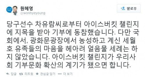 이어 원혜영 의원은 "다만 국회에서, 광화문 광장에서 농성하고 계신 세월호 유족들의 마음을 헤아려 얼음물 세례는 하지 않았습니다. 아이스 버킷 챌린지가 우리 사회 기부 문화 확산의 계기가 됐습니다"라고 덧붙였다.