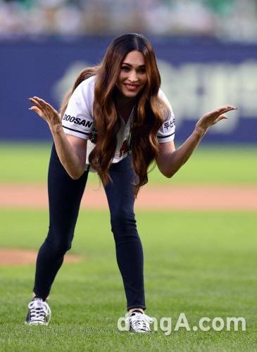 이날 시구를 위해 나선 메간 폭스는 두산 베어스 유니폼을 입은 채 마운드에 올랐다. 청바지를 매치해 남다른 비율을 과시했다.