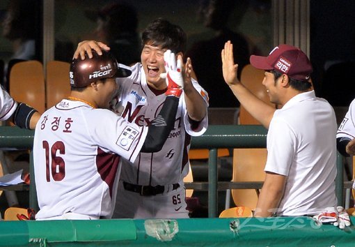 넥센 강정호(왼쪽)가 27일 목동 KIA전에서 4-4로 맞선 8회 솔로홈런을 터뜨린 뒤 동료들의 환호를 받고 있다. 이 홈런으로 강정호는 유격수 최초로 30홈런-100타점 고지를 정복했다. 목동|임민환 기자 minani@donga.com 트위터 @minani84