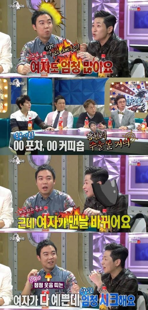 딘딘은 “황현희가 여자가 엄청 많다”며 “이촌동 여기저기서 많이 봤다. 포차, 카페에 자주 오는데 여자가 매일 바뀐다. 여자들이 다 예쁜데 황현희는 정말 시크하다. 조금 멋있었다”고 폭로했다.