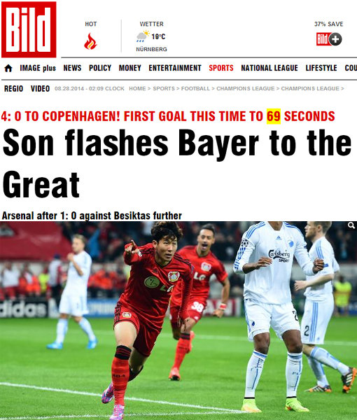경기 직후 독일 ‘빌트’는 “한국 선수 손흥민이 69초 만에 코펜하겐을 상대로 완벽한 골을 성공시켰다”고 설명했다. 이어 “레버쿠젠은 이 골로 인해 지난 1차전(3-2) 승리에 이어 이날 경기도 4-0으로 승리했다”고 설명했다.