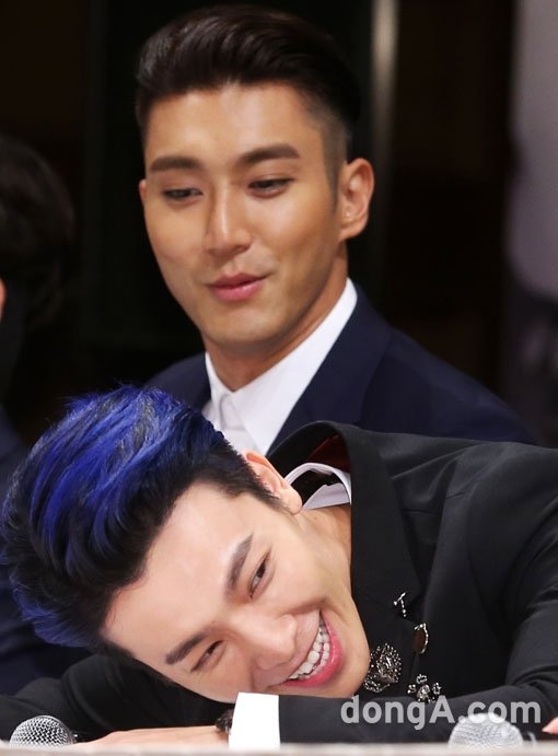 그룹 슈퍼주니어의 시원과 동해가 28일 오전 서울 강남구 임피리얼팰리스호텔에서 열린 슈퍼주니어 7집 'MAMACITA(마마시타)' 출시 기자회견에 참석해 밝은 표정을 짓고 있다.