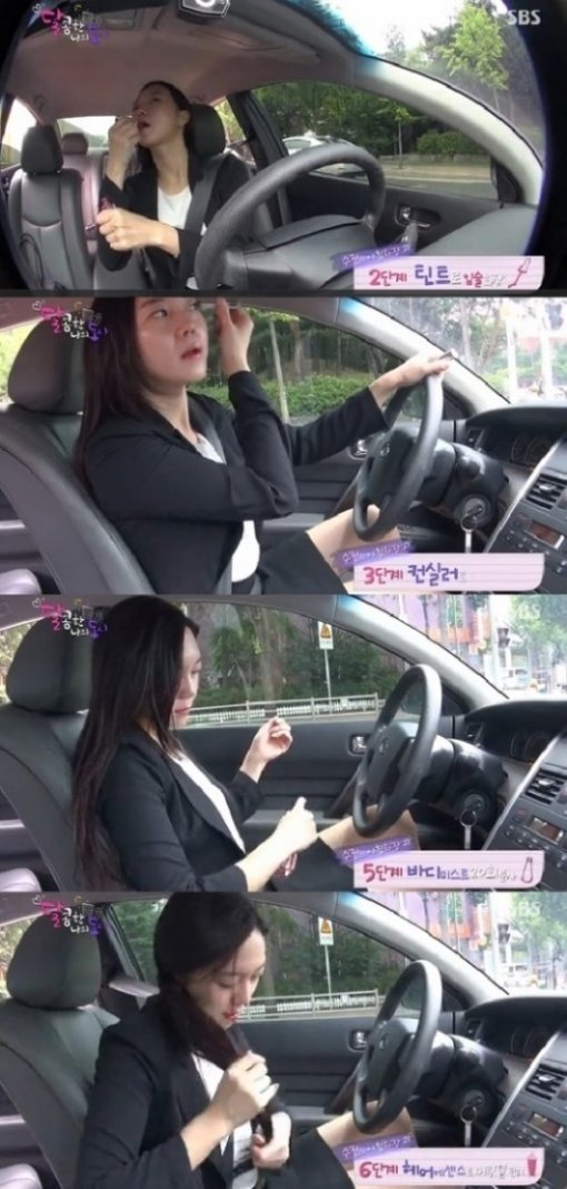 운전을 하다가 신호에 걸리면 즉시 썬크림, 틴트, 하이라이터 등을 꺼내 화장을 했고, 회사에 도착했을 때에는 풀 메이크업 상태로 변신해 있었다.