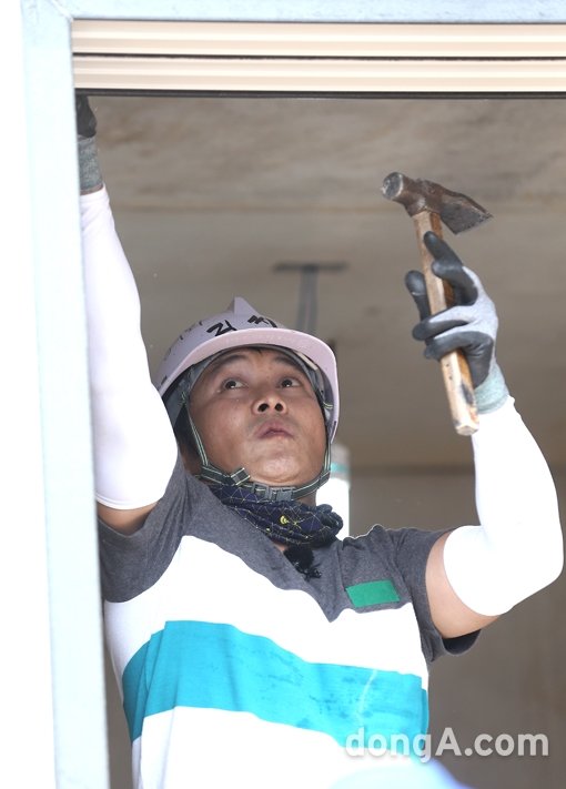개그맨 김병만이 28일 오후 충청남도 태안 일대에 촬영장에서 열린 SBS ‘즐거운 家!’ 제작발표회에서 집짓기를 하고 있다.