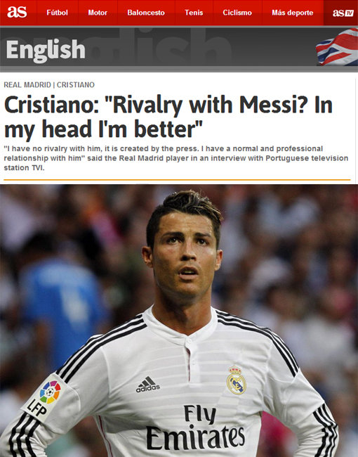 인터뷰에서 호날두는 메시와의 라이벌 구도에 대해 “경쟁 구도는 언론이 만든 것”이라고 밝혔다. 이어 “난 메시와 경쟁의식을 갖고 있지 않다. 우리는 서로를 프로 선수로 생각하고 있으며 일반적인 관계를 유지하고 있다”고 설명했다.