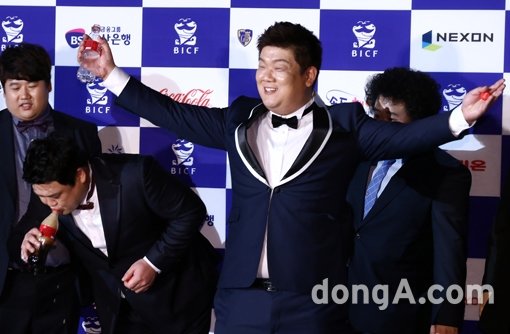 개그맨 김준현(왼쪽), 유민상이 29일 오후 부산광역시 해운대구 영화의 전당에서 열린 ‘제2회 부산국제코미디페스티벌’에서 콜라먹기 대결을 하고 있다.