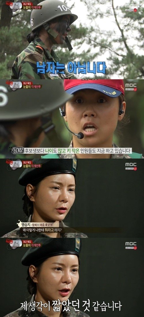 급기야 맹승지는 “무릎 꿇고 하겠다. 원래 여자는 이렇게 하는 거다”라고 말했다. 이 말에 소대장은 “그건 여자가 그렇게 하는 거지 군인은 그렇게 안한다. 군인이 되라고 했지 남자가 되라고는 안했다. 내가 아침에 이야기하지 않았냐. 못하겠으면 가라고”라면서 큰 화를 내보였다.