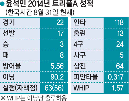 성적이 나쁠 수밖에 없었다. 8월 31일 현재 올 시즌 노포크 타이즈 유니폼을 입고 트리플A 인터내셔널리그에서 22경기(선발 17경기)에 등판했는데 3승8패, 방어율 5.56을 기록했다. 90.2이닝 동안 118안타, 13홈런을 허용했다. 볼넷은 24개 내줬고, 삼진은 64개를 잡았다. 피안타율은 0.317로 매우 높았고 이닝당 출루허용수(WHIP)는 1.57에 달했다.