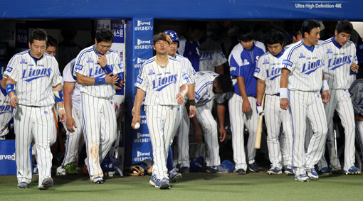 잘 나가던 삼성, 갑자기 브레이크가 걸렸다. 삼성 선수들이 8월 31일 대구 넥센전에서 0-7로 패하자 무거운 표정으로 그라운드로 나오고 있다. 삼성은 류중일 감독이 부임한 2011년 이후 처음으로 5연패를 당하며 2위 넥센에 3.5게임차로 쫓기게 됐다. 사진제공|스포츠코리아