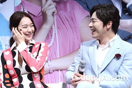 배우 신민아(왼쪽), 조정석이 1일 오전 서울시 강남구 압구정CGV에서 열린 영화 ‘나의 사랑 나의 신부’ 제작보고회에서 환하게 웃고 있다.