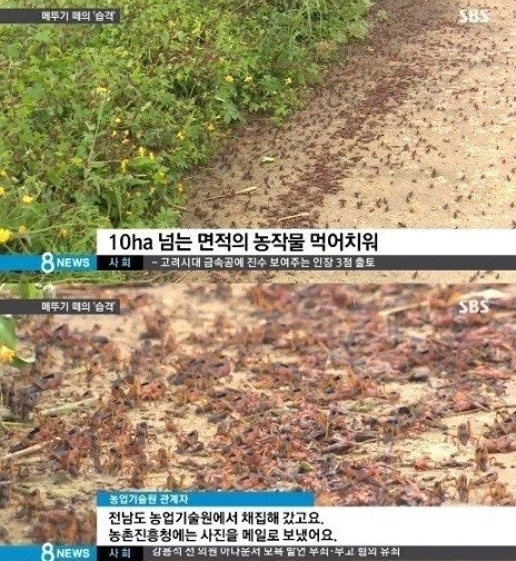 한편 이번 메뚜기떼로 인해 재배 중인 기장과 인근지역의 벼 등 20㏊ 정도가 피해를 입은 것으로 알려졌다.
