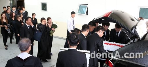 5일 오전 서울 성북구 고려대학병원 장례식장에서 열린 레이디스 코드의 故은비의 발인식에서 고인의 영정과 운구가 차량으로 이동되고 있다.
