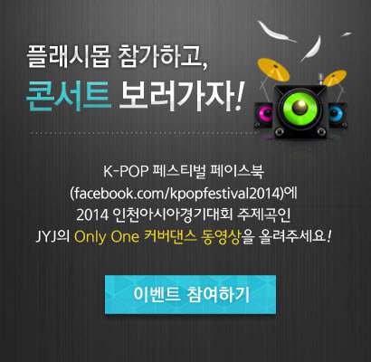 ‘K팝 페스티벌 인 인천’ 플래쉬몹 페이스북 이벤트가 5일부터 10일까지 열린다. 내외국인 누구나 응모 가능하며 ‘2014 인천아시아경기대회’ 공식 주제가 ‘온리 원’(Only One)의 커버 UCC 링크를 공식페이스북(https://www.facebook.com/kpopfestival2014)에 댓글로 붙여 참가하면 된다.