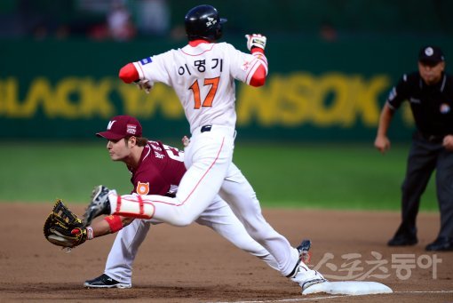 11일 인천 문학야구장에서 ‘2014 한국야쿠르트 세븐 프로야구’ SK 와이번스와 넥센 히어로즈의 경기가 열렸다. 1회말 무사에서 SK 이명기가 번트안타를 성공시킨 뒤 1루에서 세이프되고 있다.