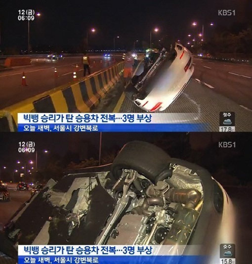 승리는 12일 새벽 3시 30분쯤 서울 강변북로 일산 방향 동부이촌동 신동아 아파트 앞에서 자신이 몰던 포르쉐 911 승용차로 옆 차선의 벤츠 승용차와 충돌한 뒤 중앙 가드레일을 들이 받고 전복되는 사고를 당했다.
