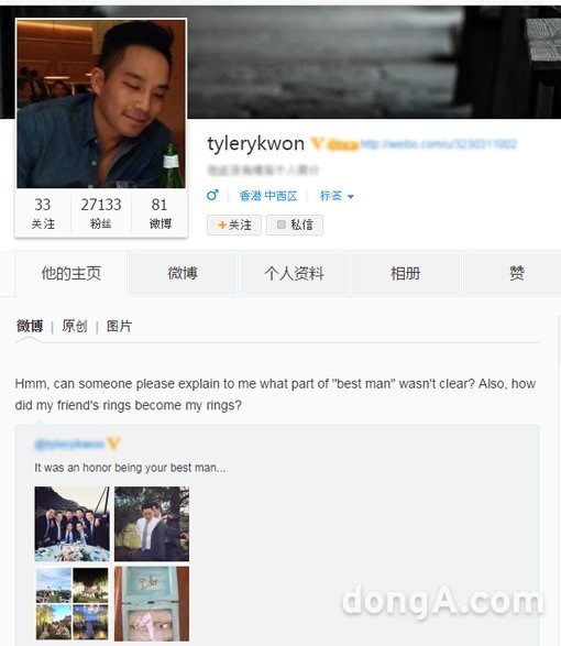타일러 권은 12일 오후 중국판 트위터인 웨이보 계정을 통해 “흠, 누가 설명 좀 해달라, 왜 친구 반지가 내 반지로 둔갑된 것인지”라는 글을 남겼다. 이는 앞서 제기된 제시카와의 결혼에 대한 해명인 것으로 해석된다.