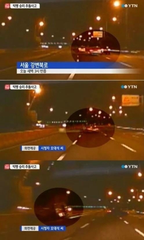 12일 새벽 3시 30분경 승리는 서울 강변북로 일산 방향 동부이촌동 신동아 아파트 앞에서 자신이 몰던 포르쉐 911 승용차로 1차선을 달리다가 3차선의 벤츠 승용차를 추돌한 뒤 곧바로 중앙 가드레일을 들이받아 차량이 전복됐다.