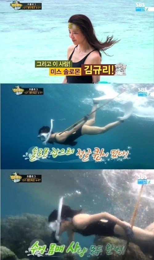 ‘정글의 법칙’의 김규리는 수영복을 입었으나 군살 없는 완벽한 몸매를 보였다. 바다 속에서도 유연한 수영실력으로 사냥에 나서 시선을 사로잡았다.
