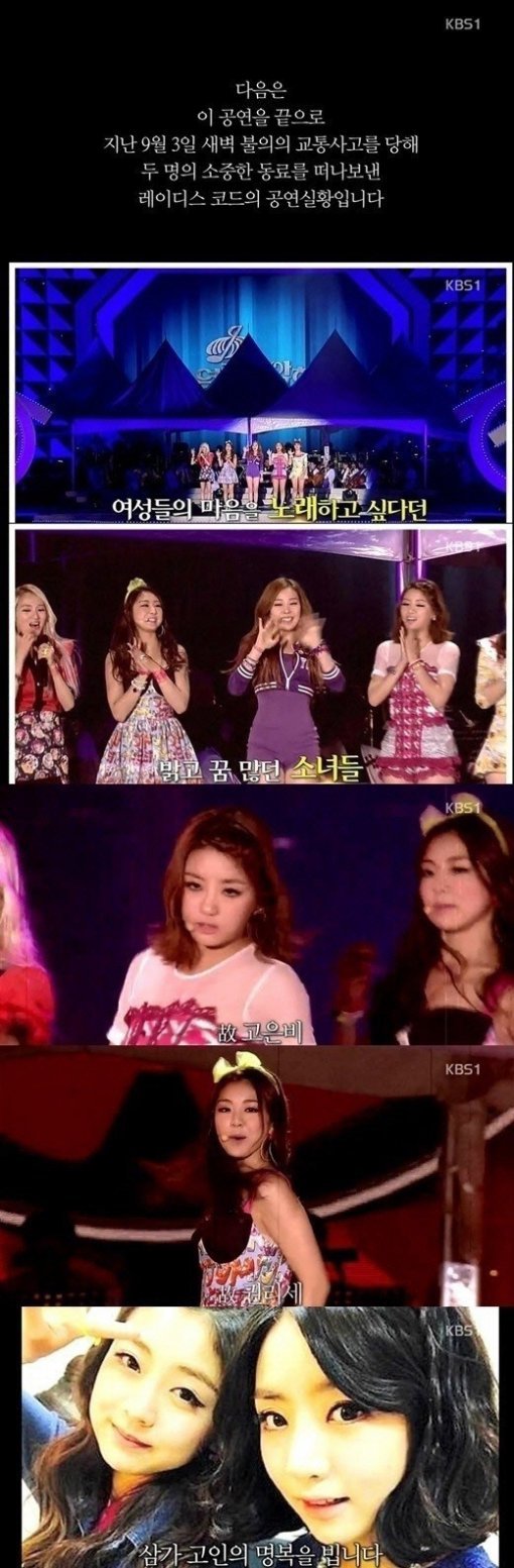 3일 레이디스 코드는 대구에서 진행된 '열린음악회' 녹화에 참여 후 서울로 이동하던 중 교통사고를 당했고 멤버 은비와 리세가 이 사고로 사망했다.