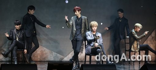 틴탑이 15일 오후 서울 마포구 메세나폴리스 롯데카드 아트센터에서 열린 틴탑 쇼케이스에서 화려한 무대를 선보이고 있다.
