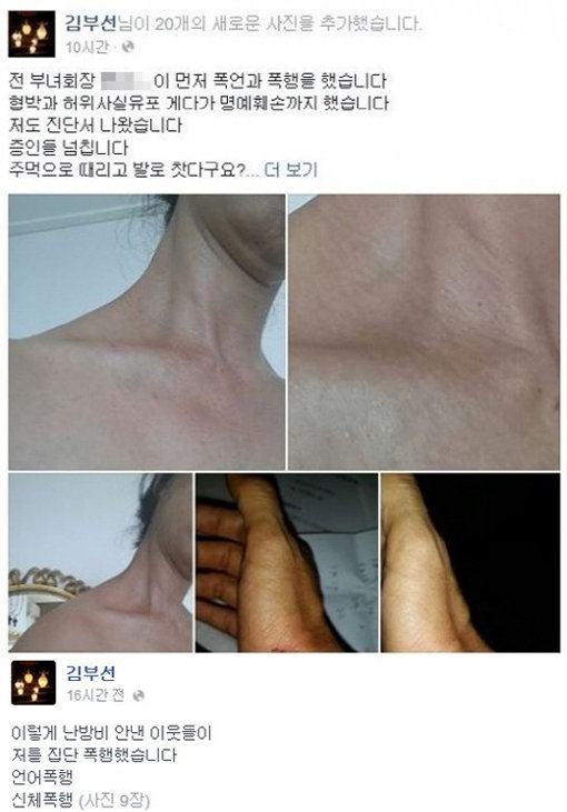 김부선은 14일 자신의 SNS를 통해 "부녀회장(A씨)이 먼저 폭언과 폭행을 했습니다. 협박과 허위사실유포 게다가 명예훼손까지 했습니다. 저도 진단서 나왔습니다. 증인들 넘칩니다. 주먹으로 때리고 발로 찼다구요? 이거 왜들 이러세요 녹취 다 있어요"라고 주장했다.