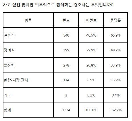 직장인들이 가장 부담스러워하는 경조사는 결혼식(65.9%)이었다. 다음으로 장례식(48.7%), 돌잔치(33.9%), 환갑·회갑 잔치(13.9%)를 가고 싶진 않지만 의무적으로 참석하는 경조사로 선택했다.