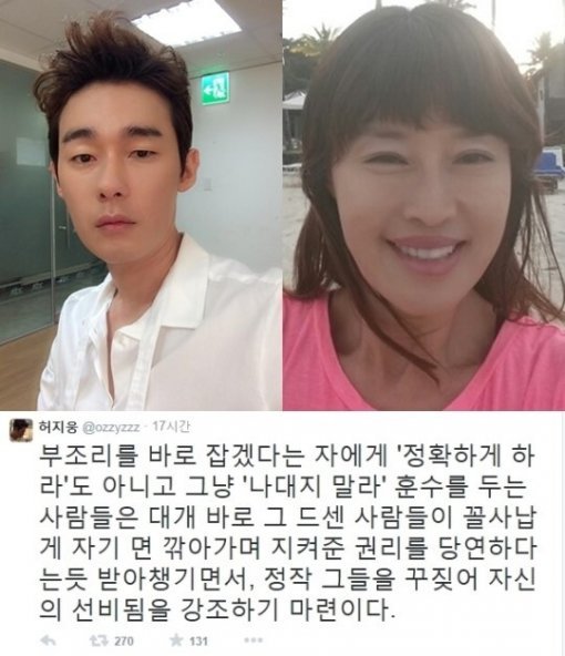 허지웅은 16일 자신의 트위터에 “부조리를 바로 잡겠다는 자에게 ‘정확하게 하라’도 아니고 그냥 ‘나대지 말라’ 훈수를 두는 사람들은 대개 바로 그 드센 사람들이 꼴사납게 자기 면 깎아가며 지켜준 권리를 당연하다는 듯 받아챙기면서, 정작 그들을 꾸짖어 자신의 선비 됨을 강조하기 마련이다”라는 글을 올렸다.