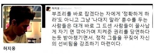 이에 허지웅은 “부조리를 바로 잡겠다는 자에게 ‘정확하게 하라’도 아니고 그냥 ‘나대지 말라’ 훈수를 두는 사람들은 대개 바로 그 드센 사람들이 꼴사납게 자기 면 깎아가며 지켜준 권리를 당연하다는 듯 받아 챙기면서, 정작 그들을 꾸짖어 자신의 선비 됨을 강조하기 마련이다”고 지적했다.