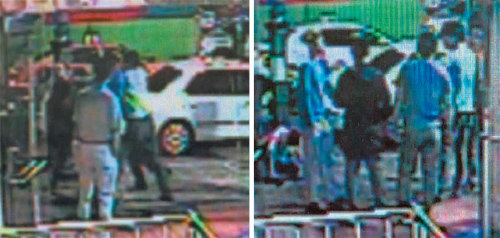 17일 오전 1시경 서울 영등포구 여의대방로의 한 일식집 앞에서 세월호 가족대책위원회 김병권 위원장, 김형기 수석부위원장 등 유가족 5명 중 몇 명이 대리운전 기사 이모 씨를 폭행하는 모습이 인근 빌딩 폐쇄회로(CC)TV에 잡혔다(왼쪽 사진). 몸싸움 직후 한 사람이 땅바닥에 주저앉아 있다(오른쪽 사진). CCTV 캡쳐