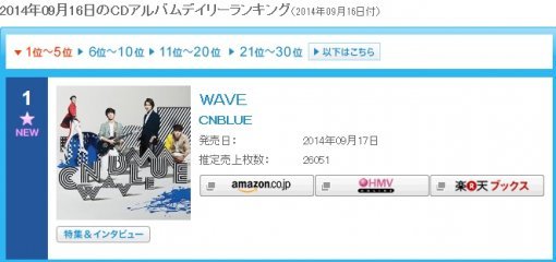 FNC엔터테인먼트 소속 밴드 씨엔블루(정용화 이종현 강민혁 이정신)의 일본 3번째 정규 ‘웨이브(WAVE)’가 오리콘 1위에 올랐다.