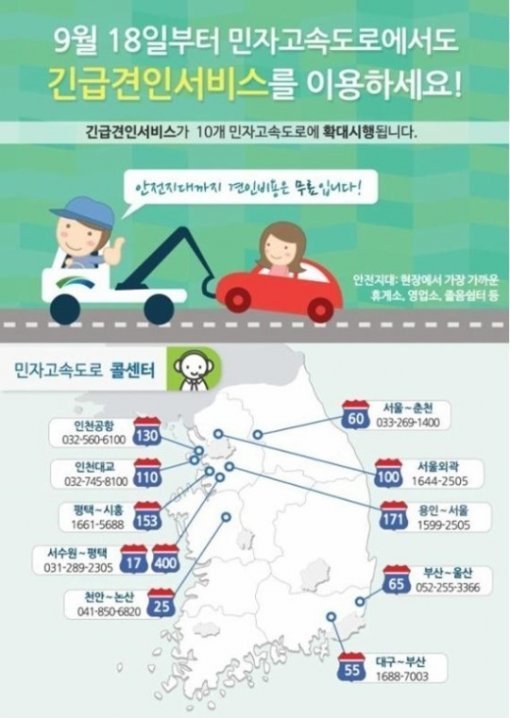 국토교통부는 17일 그간 도로공사가 운영하는 재정고속도로에서만 시행하던 ‘긴급견인 서비스’를 18일부터 10개 민자고속도로까지 확대 시행한다고 밝혔다.