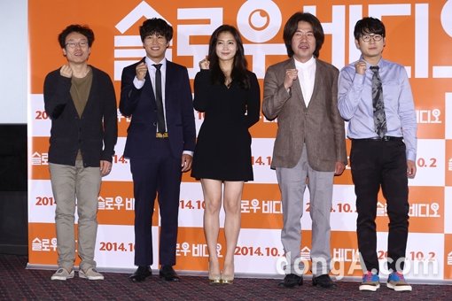 김영탁 감독(왼쪽부터), 배우 차태현, 남상미, 오달수, 김강현이 18일 오후 서울시 성동구 왕십리CGV에서 열린 영화 ‘슬로우 비디오’ 언론시사회에서 포토타임을 하고 있다.