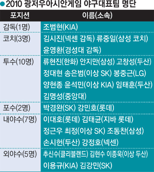 2010 광저우아시안게임을 준비하는 야구대표팀의 목표는 확실했다. 카타르에서 열린 2006 도하아시안게임 동메달의 충격을 벗고 2002부산아시안게임 이후 다시 금메달을 목에 거는 것이었다. 야구대표팀의 면면은 화려했다. 메이저리거 추신수(클리블랜드)와 일본에서 활약하는 김태균(지바 롯데)이 합류하면서 분위기가 무르익었다. ‘팀 에이스’ 류현진(한화)의 존재감도 대단했다. 2008 베이징올림픽 금메달과 2009 월드베이스볼클래식(WBC) 준우승으로 절정에 치달은 야구에 거는 기대감은 어느 때보다 높았다.
