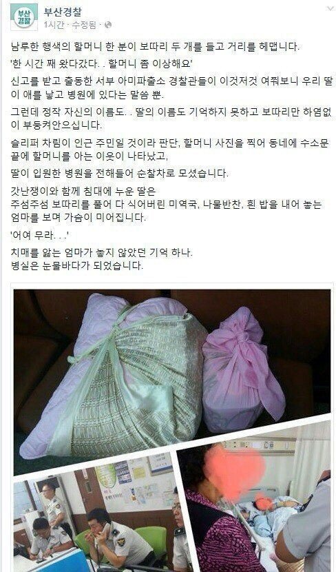부산 경찰은 지난 17일 '치매를 앓는 엄마가 놓지 않았던 기억 하나'라는 제목으로 SNS에 올려 감동적인 사연이 세상에 알려졌다.
