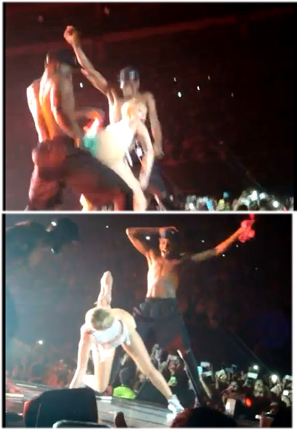유투브에 올라온 영상을 보면 사이러스는 엉덩이 모형 소품을 착용한 채 무대에 올라와 남성 백댄서와 트월킹(다리를 벌려 몸을 낮춘 상태에서 빠른 골반 바운스를 보이는 성적인 춤)을 선보였고 남자 백댄서는 멕시코 국기를 엉덩이에 문지르는 등 저급한 행동을 했다.