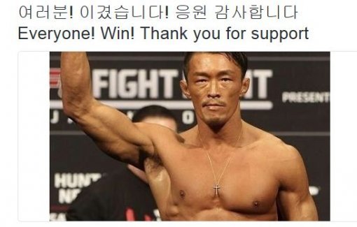 이날 추성훈은 3라운드 만장일치로 판정승을 거뒀다. 경기 직후 추성훈은 자신의 트위터에 “여러분 이겼습니다. 응원 감사합니다”는 글과 함께 한 장의 사진을 남겼다.
