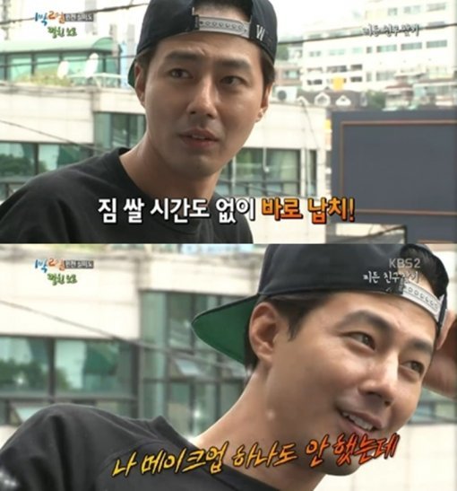 조인성은 21일 방송된 KBS2 '해피 선데이-1박 2일' 쩔친 특집에서 차태현의 방문섭외에 당혹해 하는 모습을 보였다.