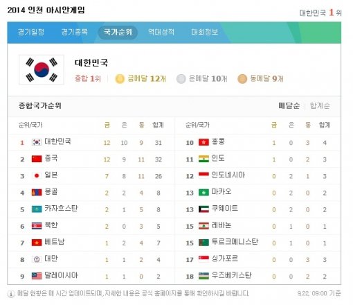‘인천 아시안게임 메달 종합 순위’
