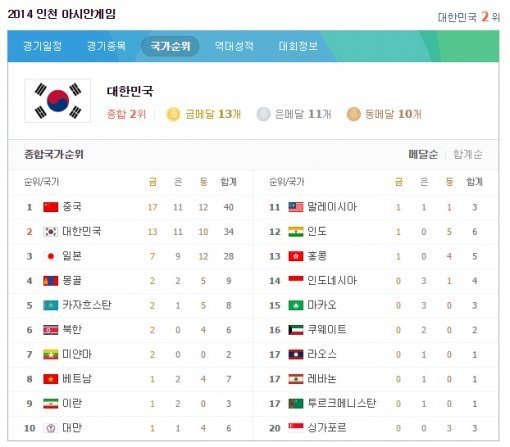 2014 인천 아시안게임에서 개최국 한국이 메달 종합 순위 2위를 달리고 있다.
