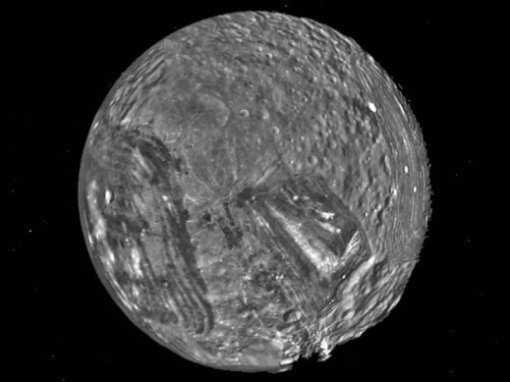 이 달은 일명 ‘프랑켄슈타인 달’이라고 불린다. 표면이 제멋대로 생긴 상처들로 가득하기 때문. 신이 만들다 버린 위성이라는 말이 있을 정도로 미란다의 표면은 기하학적인 지질구조를 가지고 있다.