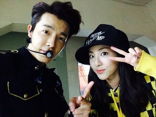 공개된 사진 속 산다라박은 ‘슈퍼쇼6’ 공연장에서 동해와 귀여운 포즈를 취하고 있다.