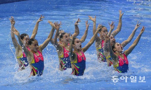 북한 싱크로나이즈드스위밍 선수들이 22일 인천 문학박태환수영장에서 열린 2014 인천 아시안게임 싱크로나이즈드스위밍 단체전에서 수중 연기를 펼치고 있다.