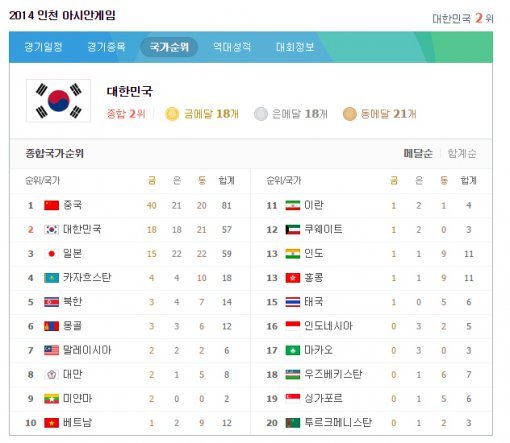 제17회 2014 인천 아시안게임에서 개최국인 한국이 메달 종합 순위 2위를 지키고 있다.