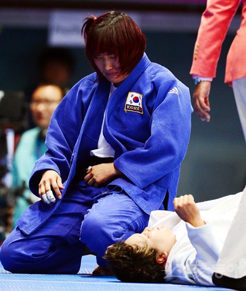 여자유도 4강전서 넘어지며 어깨뼈 빠져